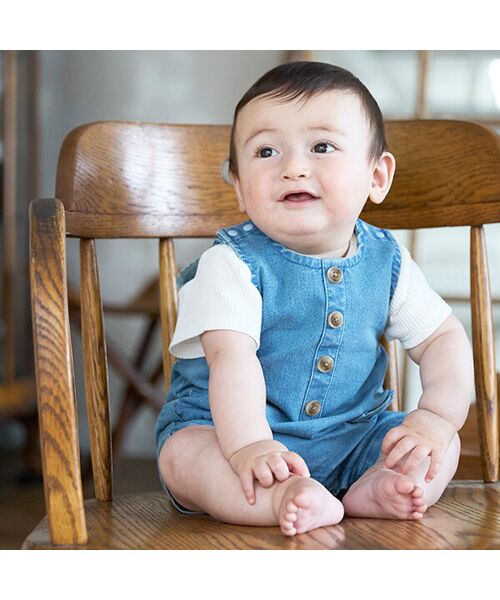 デニムでカジュアルな風合いに仕上げたショートオールです。フロントの飾りボタンがアクセントになり、可愛らしい印象を与えます。肩と股部分にスナップボタンを備えているので、お着替えやオムツ替えにも便利。中にインナーを着込めば、長いシーズン着用が可能です。内側にお名前を記入できるタグがついています。【おすすめの着用時期は春夏シーズン】【透け感】透けない【生地の厚さ】普通【伸縮性】あり【裏地】なし【ポケット】あり