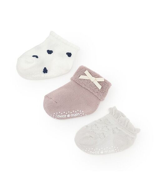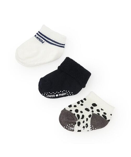 さまざまなデザインを取り入れたベビーソックスのセットです。使い分けや着回しに活躍する3足組。総柄・無地・ワンポイントを組み合わせました。お手持ちのアイテムとも相性が良い、ベーシックなカラーリング。足裏にすべり止めを備えています。