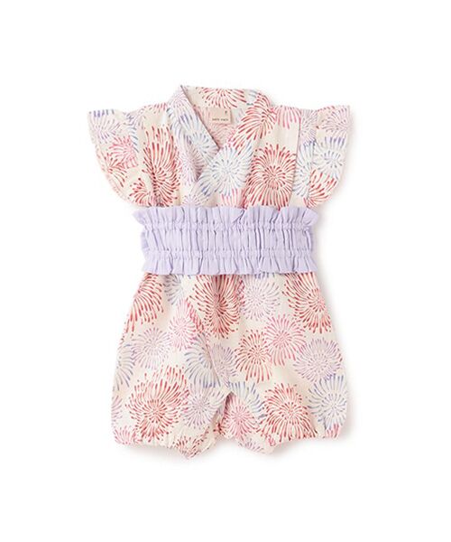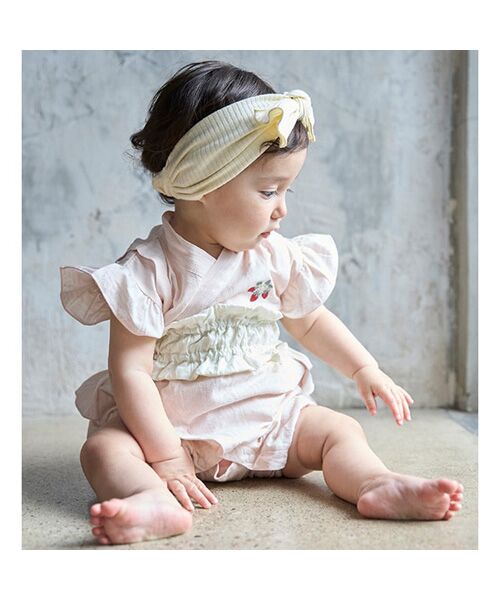 女の子らしいモチーフをデザインした甚平です。大きなリボンの帯が可愛らしさをアップします。股部分にはスナップボタンを備えており、そのままオムツ替えできるのも便利。やわらかな風合いで肌当たりが良く、着心地も良好です。内側にお名前を記入できるタグがついています。【透け感】透けない【生地の厚さ】普通【伸縮性】なし【裏地】なし【ポケット】なし【アジャスター】なし