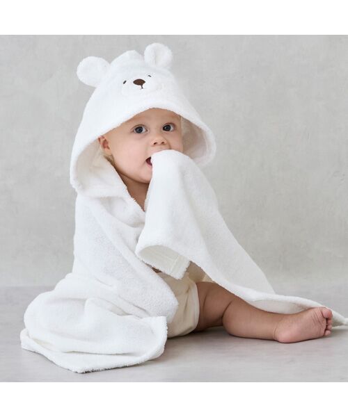 アニマルモチーフのフードが愛らしいバスポンチョです。やわらかな肌触りで吸水性の高い、使い心地の良いアイテム。首元にはスナップボタンをほどこしており、動いてもずれにくく着脱も簡単です。誕生日や出産祝いなどのプレゼントとしても喜ばれます。