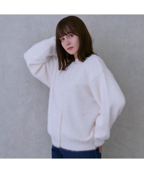 やわらかな毛足が特徴のシャギーニット素材を使用したカーディガンです。全体的に上品なパールをちりばめてお姉さん感のあるデザインに仕上げました。ゆったりとしたシルエットでインナーがかさばらないのも魅力。普段使いからお出かけまで幅広いシーンに活躍します。9654203:【リンク】シャギーニットカーディガンでキッズサイズのお子様とお揃い着用ができます。【透け感】透けない【生地の厚さ】普通【伸縮性】あり【裏地】なし【ポケット】なし
