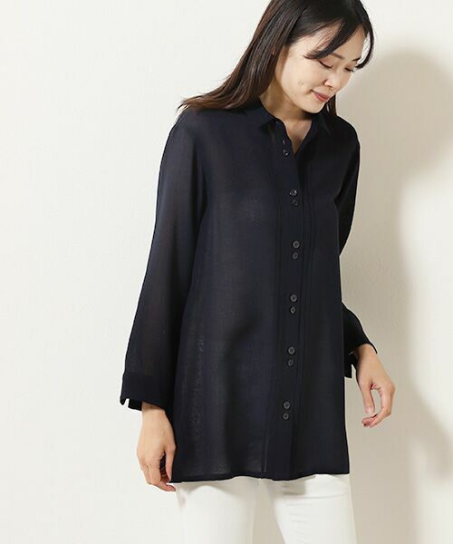 サラリとした肌触りとナチュラルな質感の麻調トリアセテート素材。シワになり難く、縮み難いイージーケア素材。ジャケット感覚で羽織にしても前を閉じてブラウスとしてもサマになる1枚です。