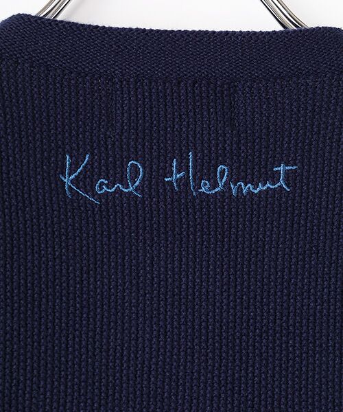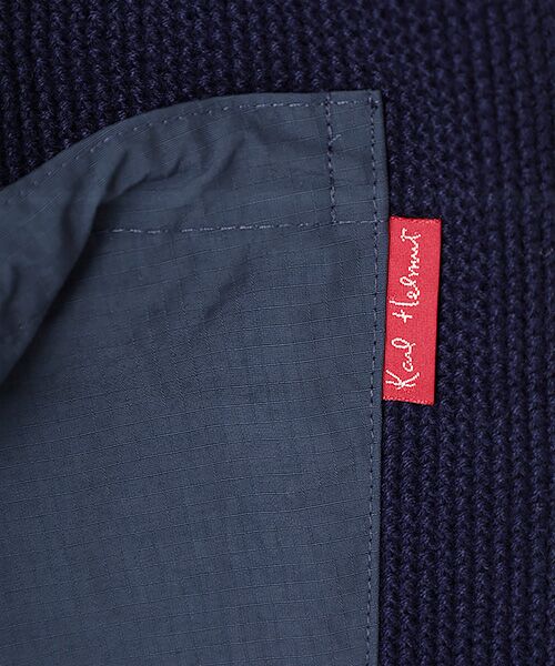 これからの春シーズン、ちょっと肌寒いときに重ねたり、コーディネイトのアクセントにもなるニットベスト。着心地よく、乾きやすくシワになりにくいポリエステルと綿の混合素材のニットに。左右に付いたポケットはナイロン素地を使用した異素材ミックスのデザインがこなれ感を演出します。左胸のところにはカールヘルムらしいネームワッペンをいくつも彩りよく並べてアクセント使いに。背中の上のところにもロゴ刺繍のワンポイント入れて、後ろすがたもスッキリとみせます。