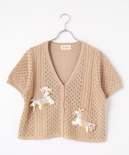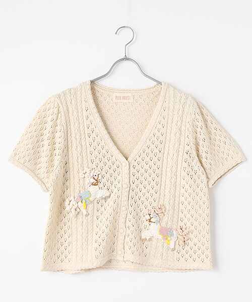 フロントの左右にネモフィラ畑から花々を運ぶポニーや、つるばらでお洒落したポニーのニットモチーフをあしらって可愛らしく。
