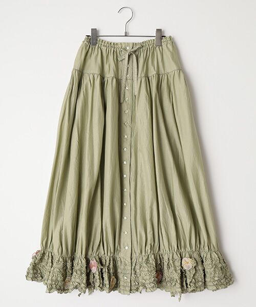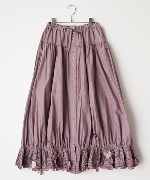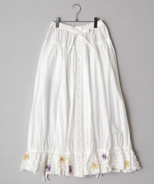 まるでゼリーのような、なだらかな曲線を描いたようなシルエットがとても印象的な綿ローンのロング丈のスカートは、裾まわりのフリル使いがとても華やか。そのままスカートとしてもお楽しみいただけますが、ペチコートとしてワンピースやスカートのインナーに重ねたときのデティールが楽しめるアイテムに。裾まわりのフリル使いのデティールのところには、パンジーのお花のかたちを象ったオーガンジーで作られたオリジナルのパンジーレースをランダムに並べてアクセントに。それぞれのカラーに合わせて2色のパンジーレースを交互にあしらって華やかな仕上がりに。