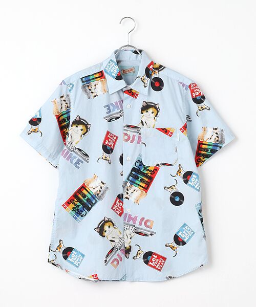 MIKEネコのDJがDJプレイを興じている前にネコたちの聴衆が並んでいる、そんな遊びごころ溢れるユニークなテキスタイル。