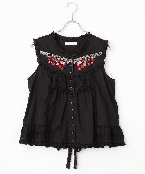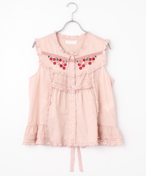 フロントのヨークのところに、レースレリーフラインの下にたわわに揺れてぶらさがっているチェリーの刺繍をポイント使いにした綿ローンのノースリーブブラウス。 アメリカンチェリーのような真っ赤なチェリーとピンク色のチェリーがたくさん連なっているさまがなんとも可愛らしい。さらに、ピコフリルやピンタック、そして細幅のサテンリボン使いといった繊細なデティールを施して華やかに仕上げました。後ろにもヨーク切り替えのデザインを施して、後ろすがたも可愛らしく仕上げています。背中のところにはにリボン紐が付いているので、シルエット感も調節できます。