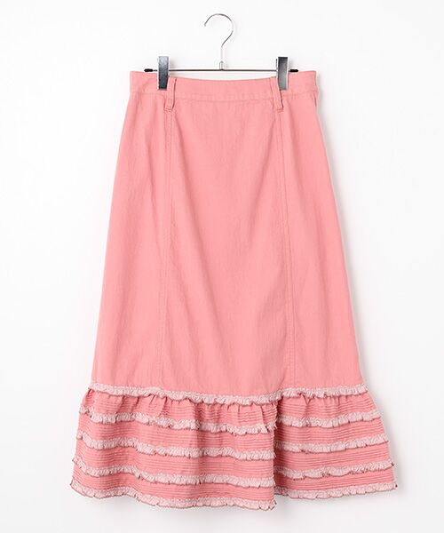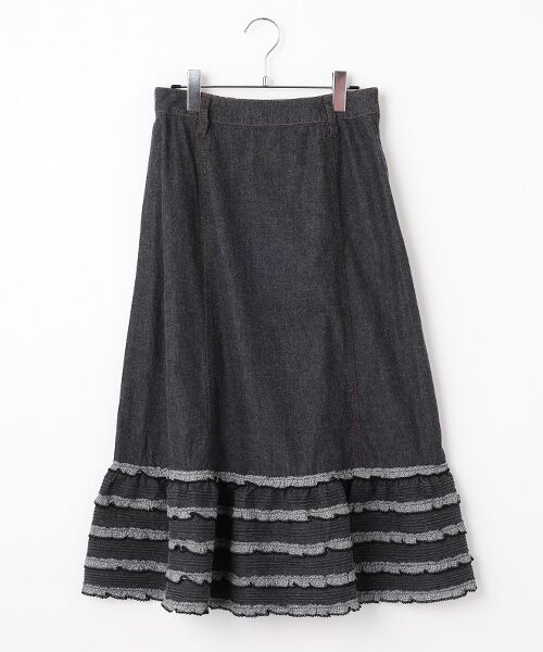 裾まわりにあしらった、オリジナルのギンガムチェックのフリル使いがとってもキュートなデニムスカート。