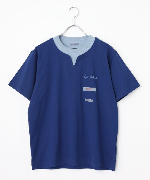 首まわりのところが2枚重ねのようなデザインになったフェイクレイヤードのデザインがとても印象的なTシャツ。夏まっさかり、重ね着はしたくないけど、いつもと同じTシャツばっかりじゃあつまらない! そんなときにピッタリな遊びごころ溢れるアイテム。左胸のところには、ロゴプリント、ロゴネームを2種類並べてアクセントに。後ろの首のところもレイヤードのデザインになっているところもポイントです!それぞれの配色使いをお楽しみください。*使用素材・・・40/2CLASSIC天竺40番の糸を2本を撚り合わせて編み立てたCLASSIC天竺カットソー。しっかりとしたボリューム感のため透けにくく、ソフト仕上げを施しふくらみと柔らかさがあり着心地よい素材感です。