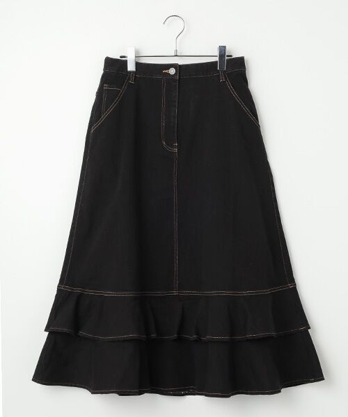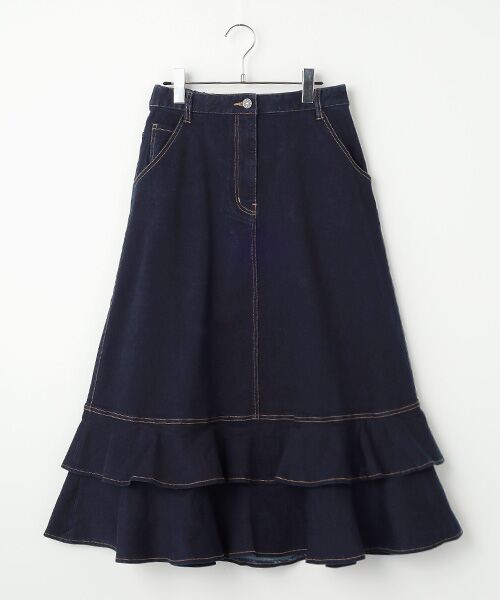 裾のフリル使いがフェミニンなデニムスカート。シンプルなので着合わせもしやすいです。程よい厚みの10オンスデニムは、通年通してお楽しみいただけます。ウエストの後ろ部分がゴムのデザインでさらにストレッチがきいているので伸縮性もあって履きやすいです。