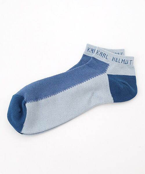 パーツごとに同系色の濃淡のパッチワークのデザインが印象的なソックス。