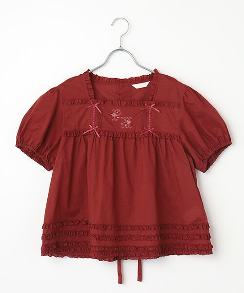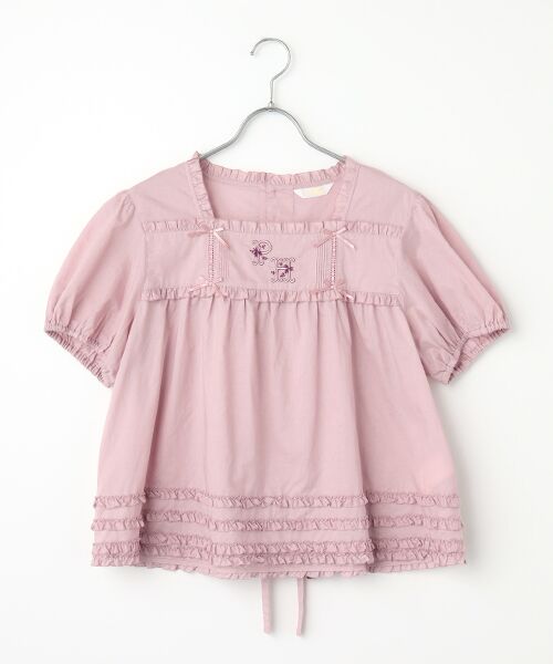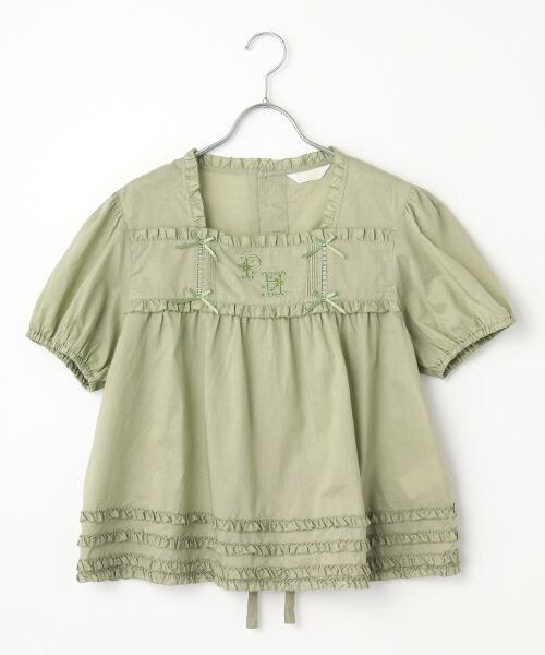フロントにPHのロゴ刺繍をあしらったローンのブラウス。 クラシカルな印象のロゴ刺繍は、葡萄をイメージしたようなデティール使いに仕上げています。葡萄の果実をぶら下げたような刺繍をあしらったデザインがなんとも可愛らしい。 サテンリボンを通したハシゴレースのデティールを添えてアクセントに。 刺繍もリボンも同系色でまとめて大人っぽく仕上げていますが、シロは、刺繍もリボンも葡萄をイメージした”マスカット色”にしてキュートな配色使いをお楽しみいただけます。