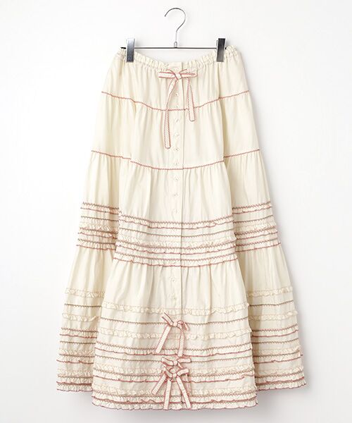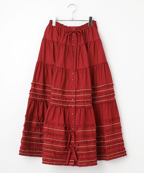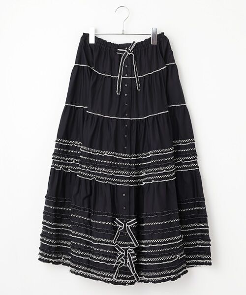 ややしっかりとしたハリ感のある綿ブロードのティアードロングスカートの裾まわりに華やかなフローラルテープを幾重にも躍らせて。