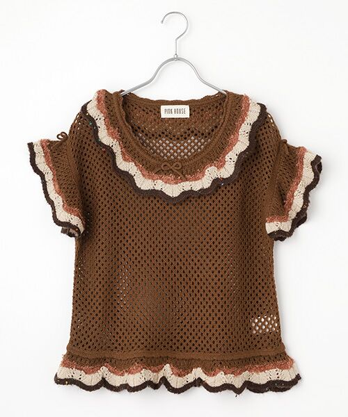 首まわりや袖、そして裾まわりにあしらったフリル編みの配色使いが可愛らしいニット。シリーズにあるフローラルテープの色合いに合わせた配色使いがなんとも可愛らしい。着合わせもしやすいのもポイントです。透かし編みの身ごろは透け感があって、まだまだ暑さを感じる初秋でもお楽しみいただけます。透け感をいかした着こなしを楽しんで。
