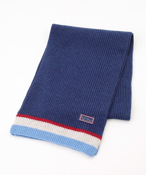 裾のところに配色ラインをきかせたマフラー。ロゴネームを添えてアクセントに。アーガイルのニットカーデと同じ色合いなので、組み合わせてコーディネイトしても可愛いです。カーディガンとともにギフトにしても喜ばれそうです。