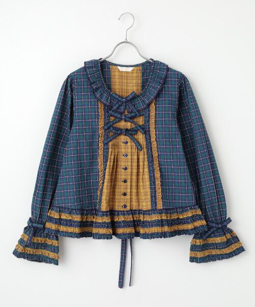太番手のスラブ糸を織り込んだオリジナルのコードチェックのブラウス。同じコードチェックを配色使いにしたデザインがなんとも可愛らしい。フロントにあしらった縦に並べた3つのリボンは、下2つは真ん中で結べるタイプになっていて外すことができます。袖のところにもリボンモチーフをあしらって、背中のところにもシルエット調整用のリボン紐が付いていてリボンいっぱいでキュートな仕上がりに。同じコードチェックのスカートとのセットアップは可愛くてオススメです!