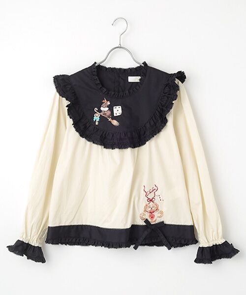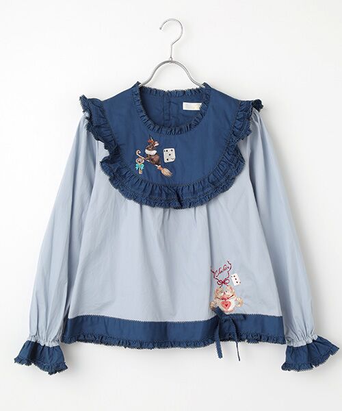 ヨークのところにはFLYING ON BROOM(ほうきに乗った魔女うさぎ)モチーフを、左の裾のところにはTWINS CHESHIRE(双子のチシャネコたち)モチーフの刺繍をそれぞれあしらってポイント使いにしています。