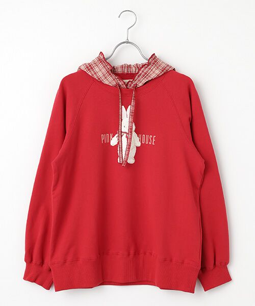 フリルをあしらったオリジナルチェックのフードがなんとも可愛らしい。フード付きのチェックのブラウスをなかに重ねてる風。重ね着をしなくても1枚でレイヤード風な着こなしが楽しめるアイテムに。