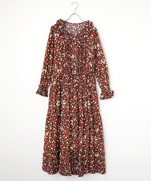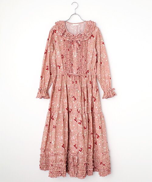 ロゴリボンとちいさなバラの柄が可憐なイメージのプリント。「バラ園うさぎプリント」よりすこし濃いめの色だしで大人っぽく仕上げています。襟付き、長袖のロングティアードワンピース。ウエストまわりのところになかにリボン紐が通っているのでフロントで結んでシルエット感を調節できて大人可愛く着られます。前開きタイプなので、重ね着もできるので華やかな着こなしもお楽しみいただけます。