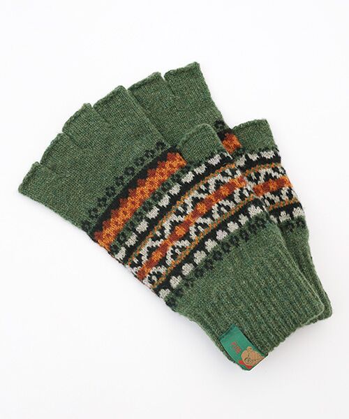 ノルディック風の編み込み模様が可愛いニット手袋。指の先のところがフリーになっているので、スマホを操作しやすかったり作業がしやすく使いやすいタイプ。右手の手首のところには、顔クマネームを挟み込んでアクセント使いに、同じ編み込み模様のニットキャップとお揃いにしても可愛いです。ギフトにも最適です。
