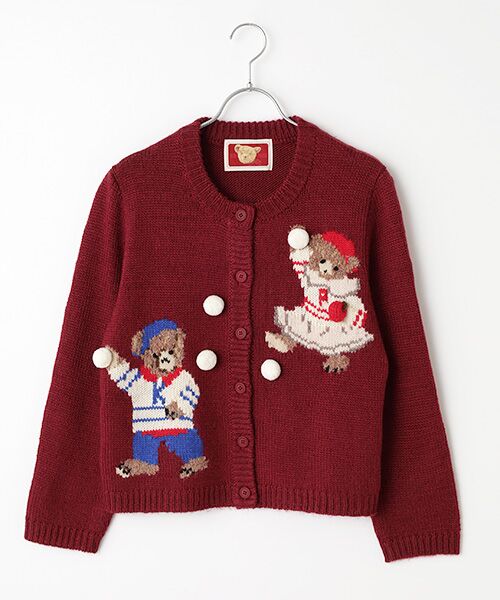 それぞれのくまの子たちを、程よい厚みのあるニットに左右に編み込んで可愛らしいく仕上げたニットカーディガン。