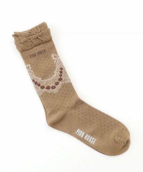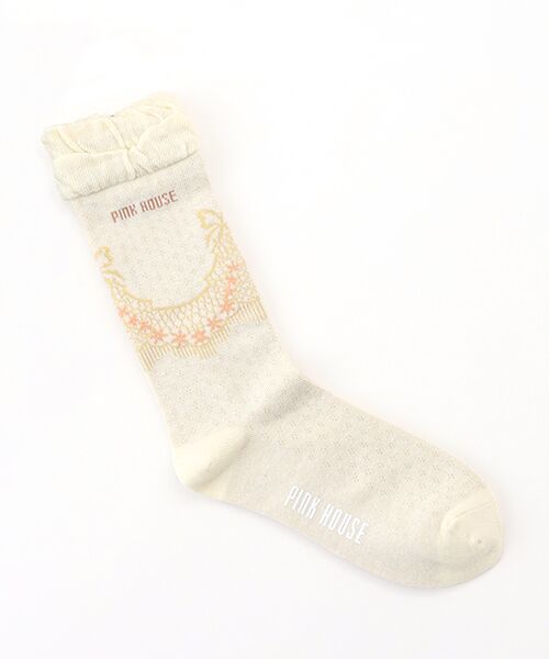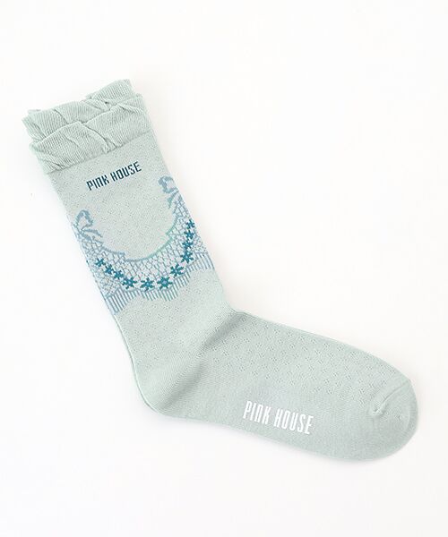 チュールとコットン、2種のレースを組み合わせたオリジナルのロココレースを、そのまま柄に落とし込んだ上品で華やかなソックス。 レースのヘムのところのお花の刺繍と格子状のドレープ使いを繊細に表現しています。 履きぐちのところには小さくロゴと重ね合わせたフリル使いが気品高い装いに仕上げてくれます。 よく見ると、小さく小紋柄がさりげなく入っているところもポイントに。