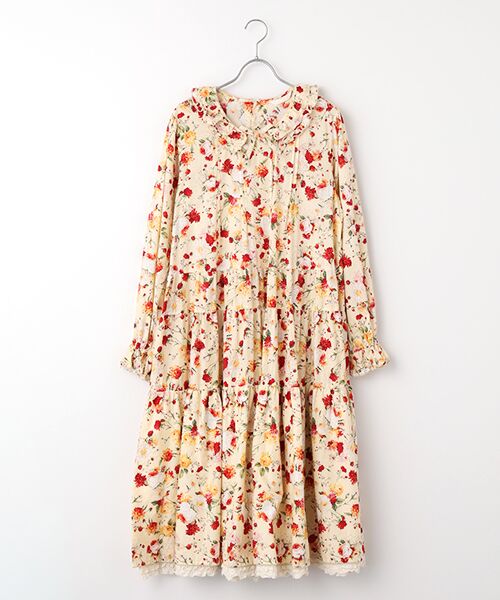 フリル襟の付いた長袖タイプのワンピースは、ウエストあたりから切り替えの入ったふんわりとしたティアードシルエット。後ろの背中あたりにリボン紐を結んでシルエット調節も可能です。