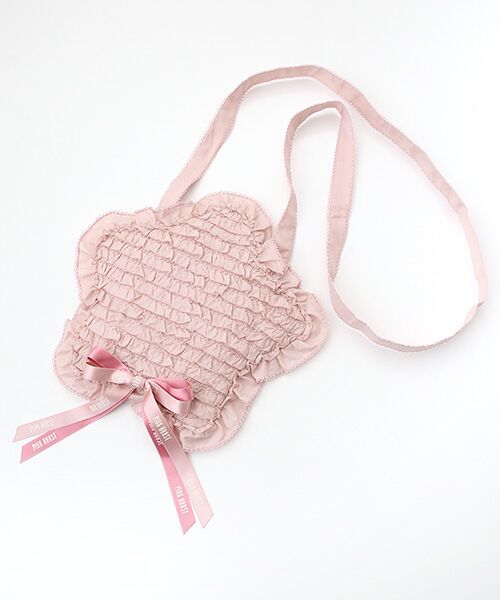 星のかたちが可愛らしい、フリルをいっぱい敷き詰めたキュートなポシェット。さらにピコフリルの縁取りを添えて華やかに。裾まわりにはそれぞれのカラーに合わせた2色のロゴ入りサテンリボンを結んでアクセントに。なかに軽く中わたが入ったふんわりとした仕上がりに。内側にも外側にもポケットが付いていて、外ポケットにはスナップボタンが付いています。入りぐちのところにもスナップボタンが付いていて留められます。「シロ」は、ソライロのピコット刺繍の縁取りを添えてアクセントにしています。