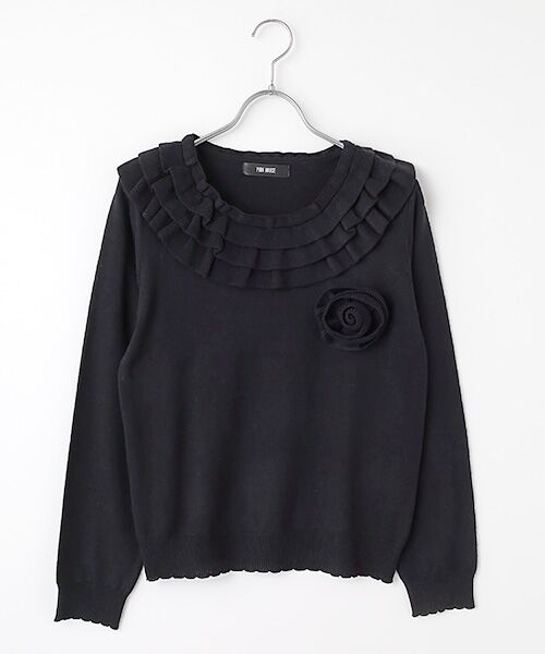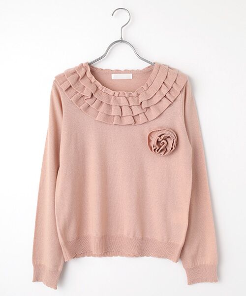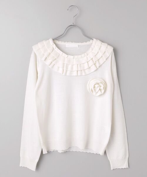 首まわりにあしらったフリル使いがフェミニンで華やかなニット。同じニット地のフリルをお花なかたちにしたミニブローチ付き。ブローチは外してお好きなところに付けられます。