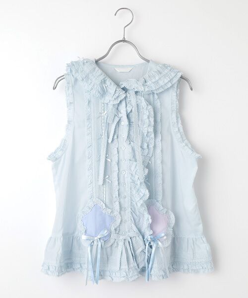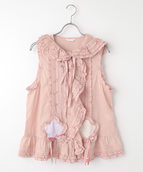 ピコフリルにピンタック、サテンリボンにはしごレースといったキュートなディテールをふんだんにあしらったローンベスト。