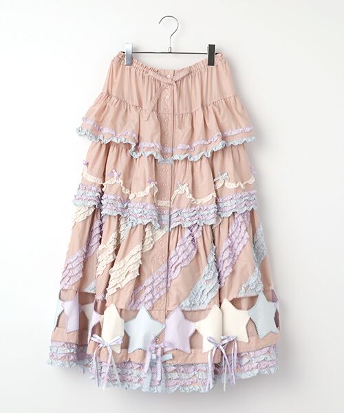 星のかたちをしたキュートなワッペンを裾まわりに連ねたローンフリルの段々ロングスカート。ワッペンはそれぞれのカラーに合わせた配色使いがお楽しみいただけます。星のワッペンたちのまわりにはさらに配色フリルをあしらって。斜めのラインがまるで流れ星のよう。さらにそれぞれの段々フリルにも配色フリルをあしらった豪華で華やかなフリルスカートに。カラーによって雰囲気が異なるので、どのカラーにしようか迷うところも楽しい1枚に。