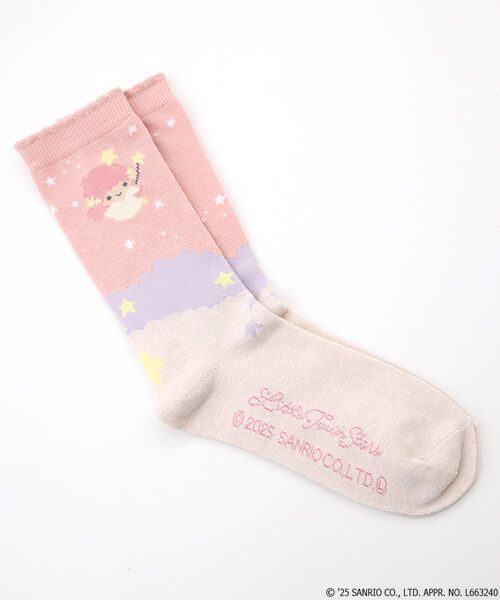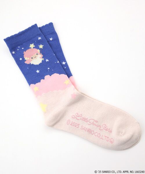 「A Starry Night Wishプリント」から、柔らかな色合いの空の背景色に優しく微笑むキキ&ララがふんわりと星空を舞うすがたを描いたソックス。