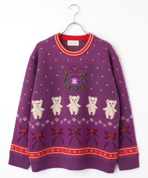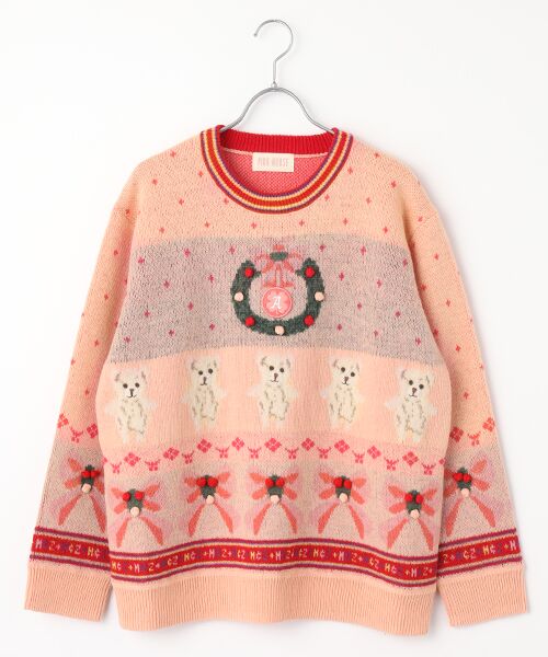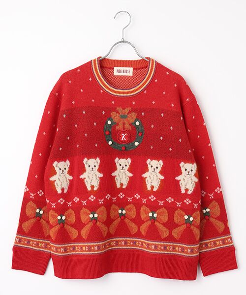 リースやリボンの飾りなど、これからのホリデーシーズンにピッタリなニット。
