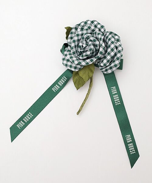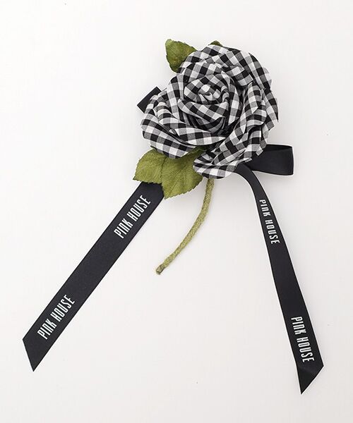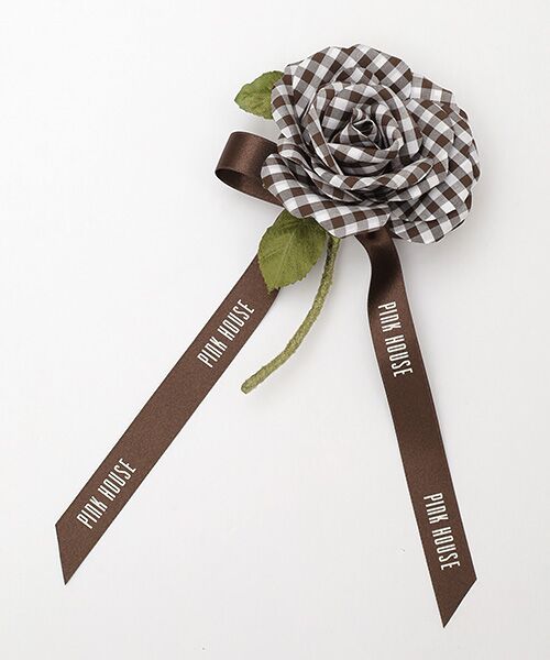 シリーズに合わせてギンガムチェックでローズモチーフを作ってそのまま可愛らしいミニコサージュに。一厘咲きのローズに、ロゴ入りサテンリボンを結んでキュートで華やかに仕上げました。シリーズのコーディネイトはもちろん、他のコーディネイトやバッグや帽子などに付けても可愛いのでオススメです。小ぶりなので、色違いで重ね付けしても可愛いのでいろいろとお楽しみください。