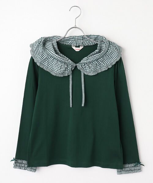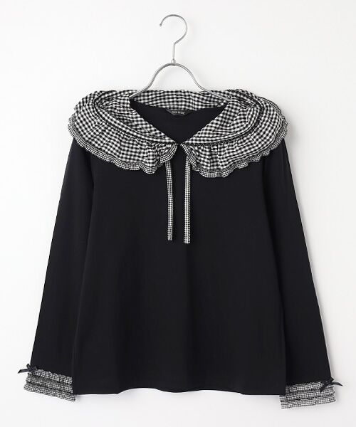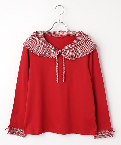 袖ぐちにも小ギンガムのフリルを重ねてミニリボンを可愛くトッピング。重ねて着たときにも可愛く着られます。