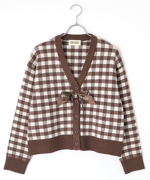 シリーズに合わせたギンガムチェックの格子柄を編み込んだニットカーディガン。秋冬ファッションに合わせやすい色使いと、大柄の格子がクラシカル感たっぷりな仕上がりに。カジュアルに着合わせのしやすいVネックタイプ。ちょっぴり着丈の短めのショートタイプは、トップスがコンパクトにまとまるので足長効果も期待できそうです。フロントにあしらった大小のロゴ入りサテンリボンのデザインは、「スウィートメモリーズ」のプリントのなかにもあるラッピングリボンをイメージしています。