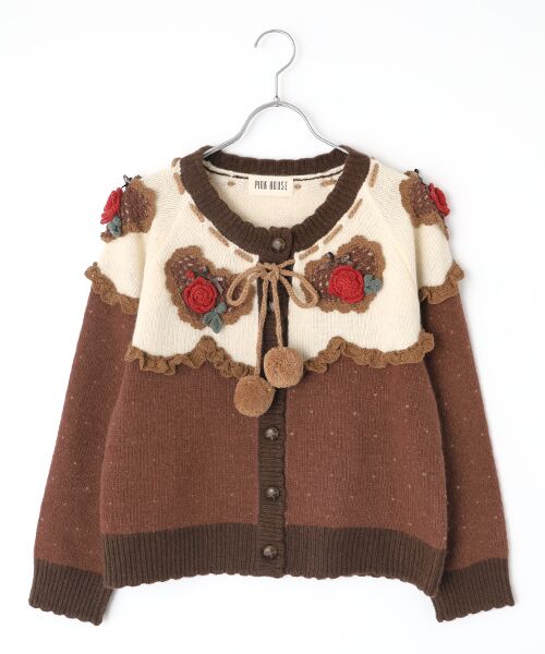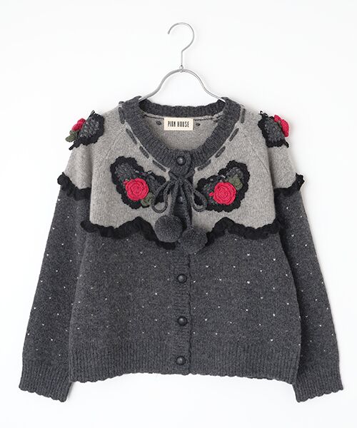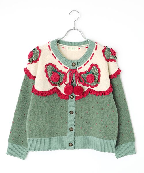 可愛らしいハート型のニットアップリケを、ヨークまわりにいくつもあしらったニットカーディガン。