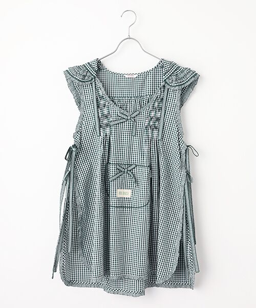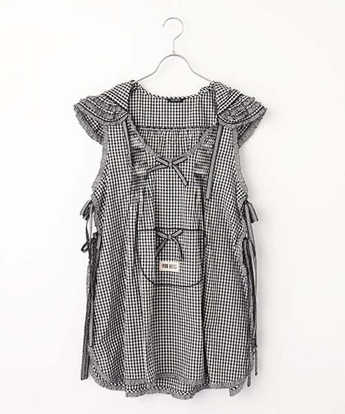 細かい格子の小ギンガムのフリルを部分使いにしたパッチワーク風のデザインがキュートで華やかな仕上がりに。