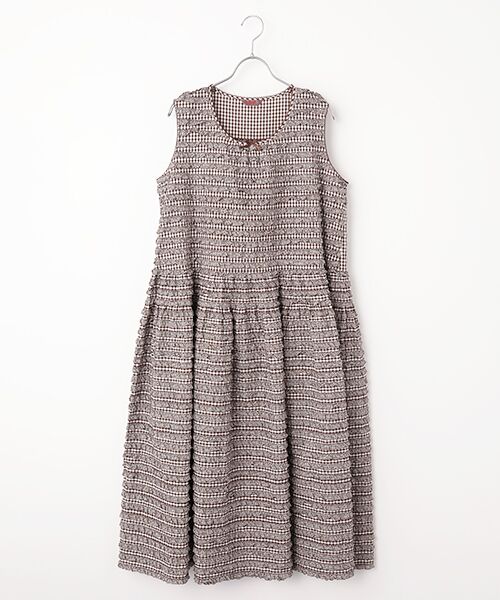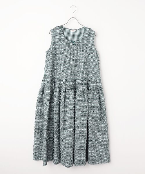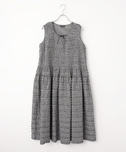細やかな格子の小ギンガムのフリルを全面に敷き詰めて、華やかでボリューム感たっぷりのドレスワンピースに仕上がりました。