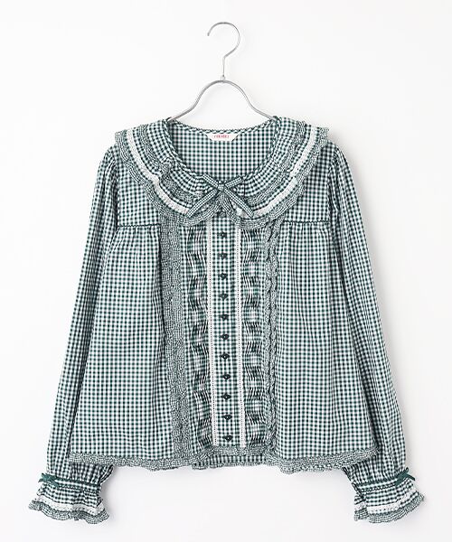 ギンガムチェックのブラウス。フリル感たっぷりの襟が可愛らしい。首もとにはリボンモチーフを添えて。「スウィートメモリーズ」のプリントのなかにも登場しているギンガムチェック。今回は、丹念に紡績された上質な細番手の60/1糸を使用し、兵庫県西脇山地にて製織された伝統的なポプリンギンガムチェックを使用。絶妙な打ち込みバランスにすることで、上品な表面感と肌ざわりを表現しています。真っ白なコットンのトーションレースをところどころにアクセントにきかせて。濃色のシロ色が秋冬ファッションに映えます。フロントボタンはハート型のボタンを採用しているところもポイントに。