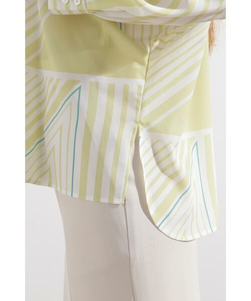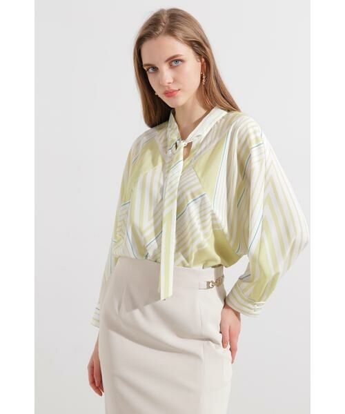 大胆な幾何学柄が目を引くブラウス。クラシックな印象のスタンドカラーとボウタイ付きのデザインがスタイリッシュな印象を与え、ラグランスリーブのゆったりとしたシルエットが、モダンでリラックスした雰囲気を演出したブラウスです。シンプルなボトムスと合わせることで、洗練されたスタイリングを完成させてくれるアイテムです。