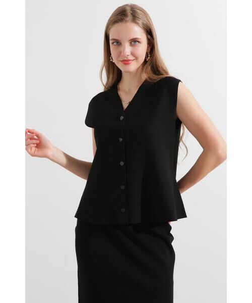 ウエストまでをコンパクトにし、裾にかけてフレアを入れたシルエットがポイント。肩が隠れる丈のノースリーブで二の腕のシャープに見せてくれます。同色のメタルボタンも上品でポイントになっています。裾に広がったデザインなので、スリムパンツやタイトシルエットとのスタイリングがおすすめです。同素材のスカートもあるのでセットアップでも着用していただけます。