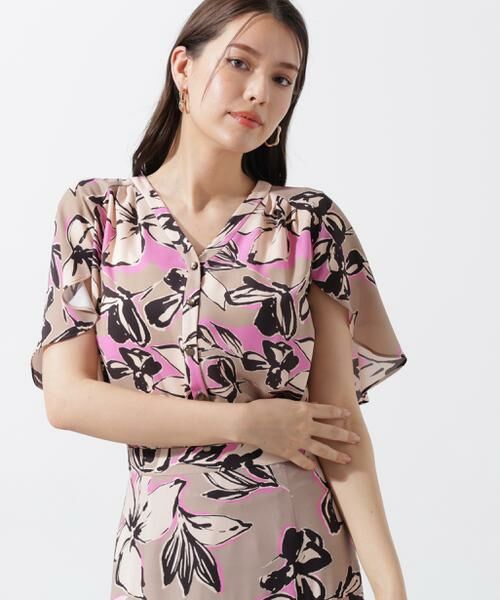 ケープのように大胆にデザインされたスリーブが際立つ存在感のあるブラウスです。空気をふくんだようなスリーブラインが特徴です。衿元はVカットに仕上げ、抜け感を出したデザインです。同素材のスカートと合わせてワンピース見えのコーディネートもおすすめです。【素材説明】細かな凹凸がありパウダリーなタッチで、光沢のある梨地素材に、線画タッチのフラワープリントをのせたオリジナル素材。ラインの太さの強弱や重なり、かすれなどにより、立体感や陰影を表現。流れるように散らされた花々がエレガントな雰囲気です。【商品特性】前釦あき/ストレッチなし/裏地なし<関連商品>フラワーラインプリントマーメイドスカート(0315220700)透け感/なし|裏地/なし|光沢/なし|生地の厚さ/普通|伸縮性/なし|シルエット/スタンダード