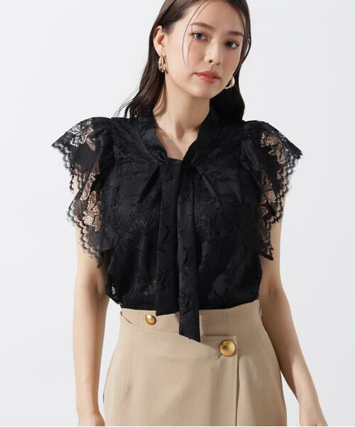 ソフトな肌触り光沢のある上品なレース生地を使用したボウタイブラウス。
