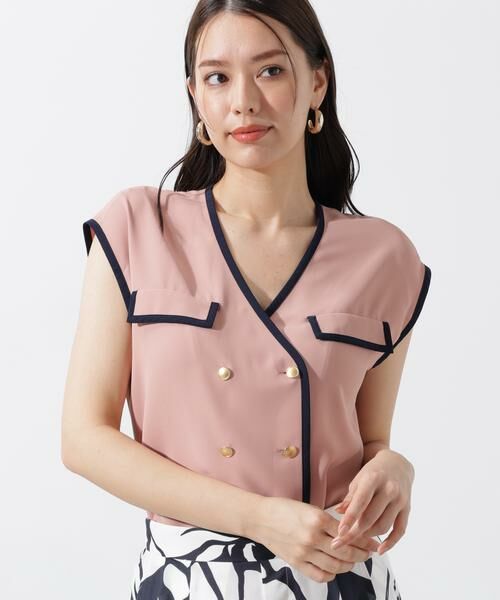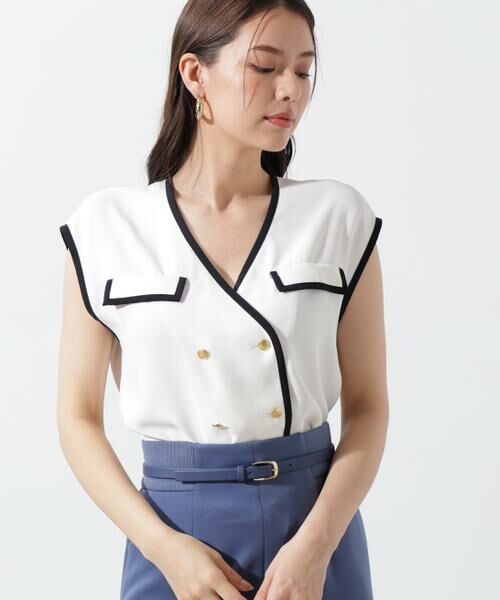 フロントのダブルの打ち合わせとメタルボタンがアクセントになったデザインで、バイカラーのバインダーディテールが、スタイリングにシャープな印象をプラス。