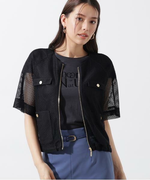 やや下がったネックラインが涼しげな雰囲気を演出し、フロントジップとメタルボタンがアクセントとなってスタイリングを引き締めます。大人のカジュアル感を引き立てる半袖丈で、裾のスピンドル仕様により、ボトムのシルエットに合わせてウエストを絞ることができ、バランス調整が可能。スッキリとした印象で着こなせる一着です。