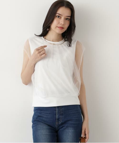 スムース素材のタンクトップにチュールを重ねたノースリーブトップス。