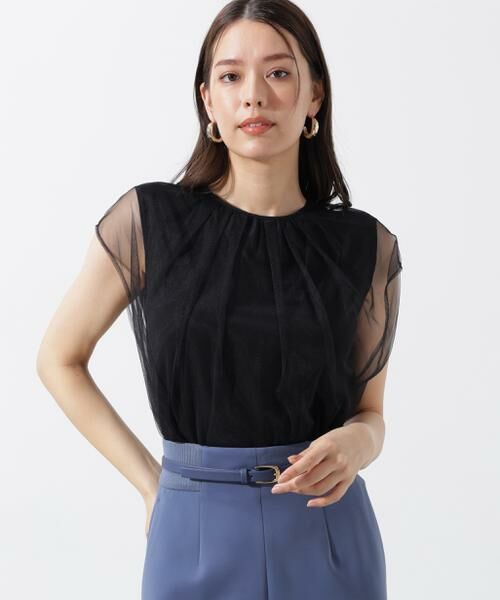 程よくハリのあるチュールを使用することで、襟ぐりのギャザータックがふんわりとした立体感を生み出しています。チュールは、肩を覆う長さで、二の腕もカバー。シワを気にせず気軽に着用出来るのも嬉しいポイントです。