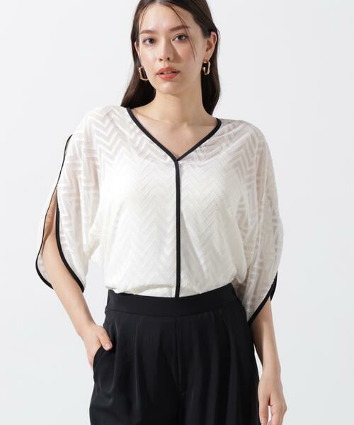 すっきりとシャープなVネックに、深めのスリットが入ったボリュームスリーブが上品で洗練された印象を与えます。