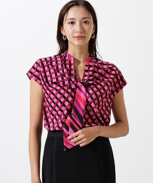 2種類のプリントを使用したボウタイブラウス。身頃はレトロなジオメトリックプリント、ボウタイリボンとカフス部分をバイヤス柄の生地で仕立てました。Vネック×バイヤス柄の組み合わせで顔周りはシャープに、ボウタイリボンとタックで胸元は華やかに見せます。クラシカルなプリントとレディライクなデザインで、大人の女性の美しさを引き立たせるブラウスです。